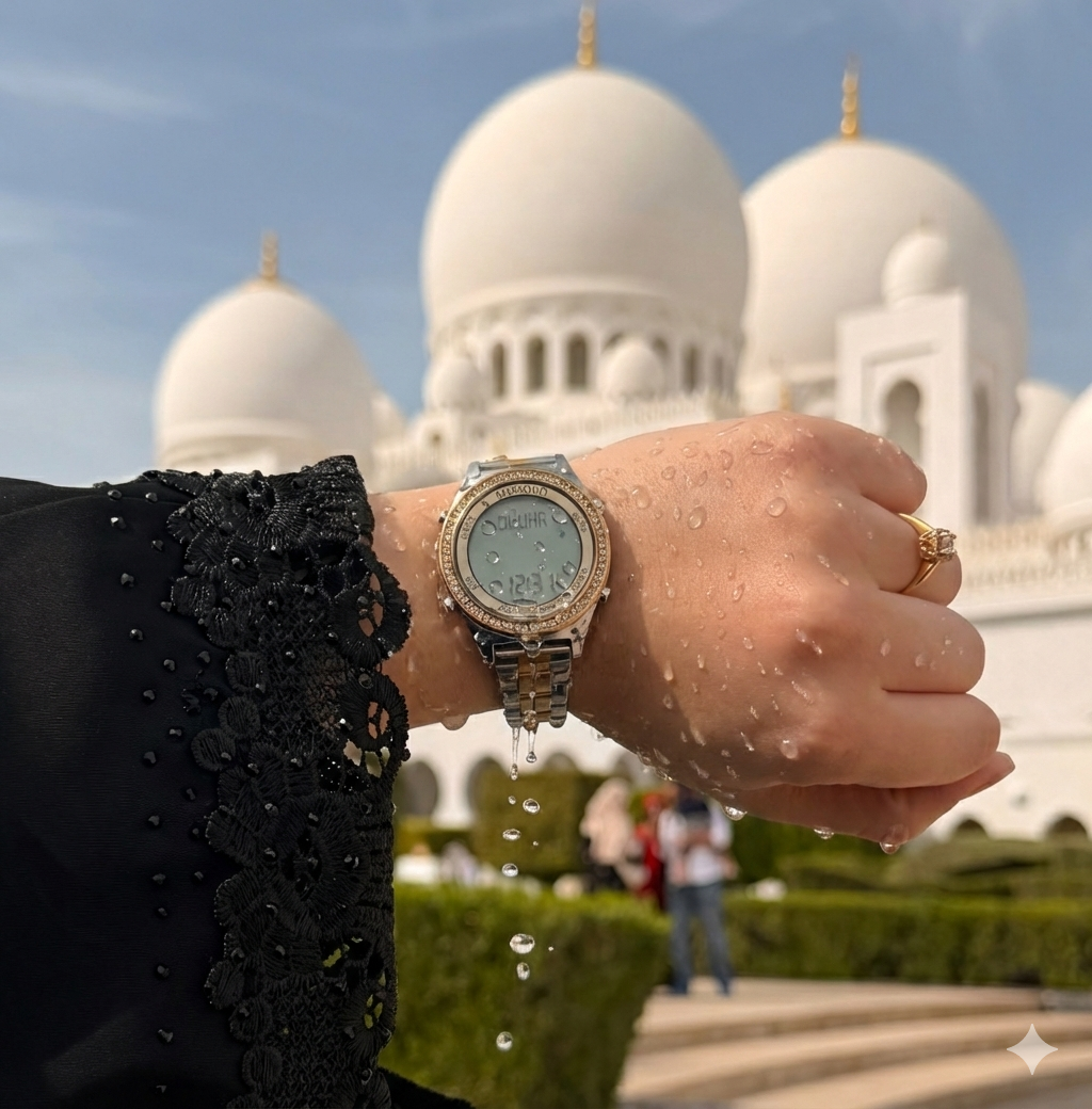 Het horloge herinnert je subtiel aan de vijf dagelijkse gebeden en helpt je je gebedstijden niet uit het oog te verliezen.