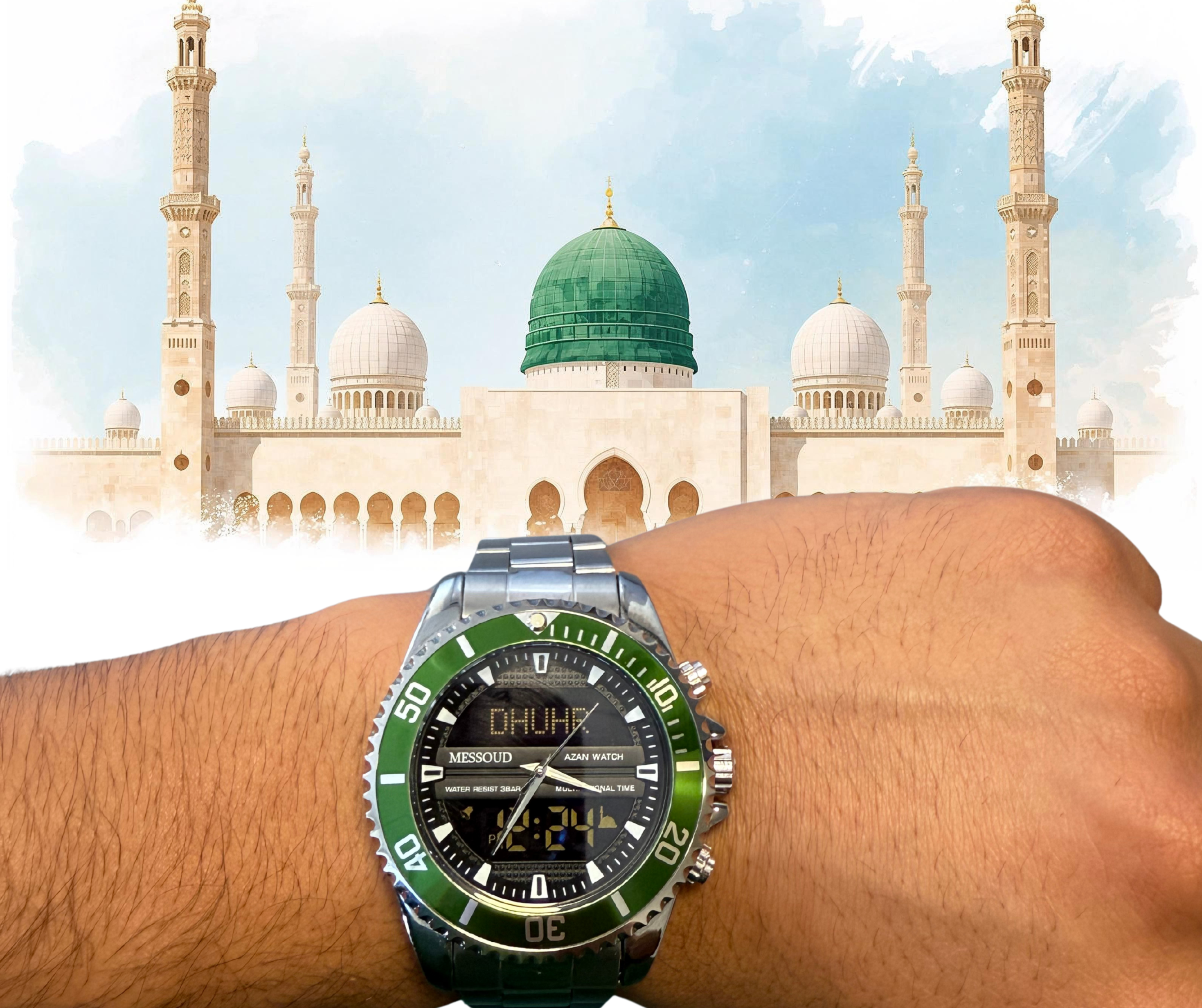 Altijd herinnerd aan je gebedstijden. Een stijlvol horloge dat je automatisch herinnert aan de vijf dagelijkse gebeden.